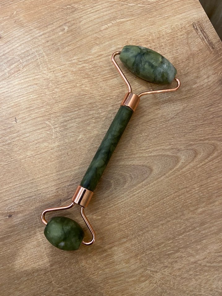 Yeşim taşından yapılmış, yeşil taşlar ve metal çerçeveye sahip yüz masaj aleti. Sayılı kullanıldı