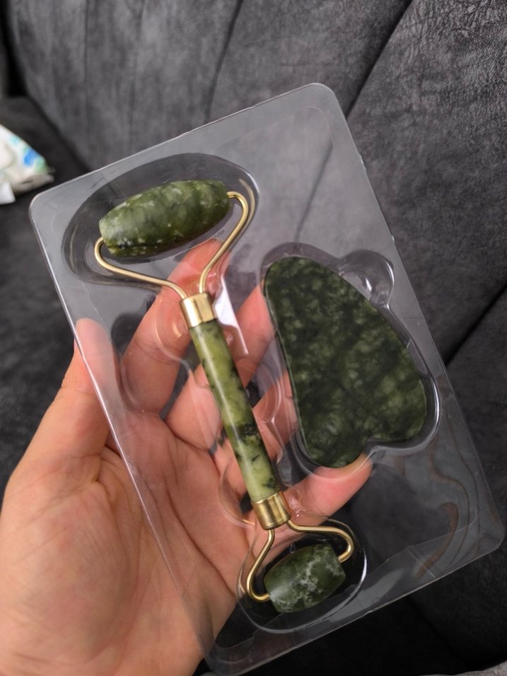 Yeşim taşı yüz masaj aleti ve gua sha taşı içeren set, cildi rahatlatır ve kan dolaşımını artırır.