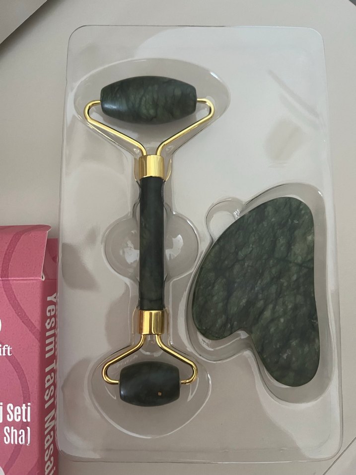 Yeşim taşından yapılmış yüz masaj seti, jade roller ve gua sha taşını içerir. Cilt bakımı için uygundur.