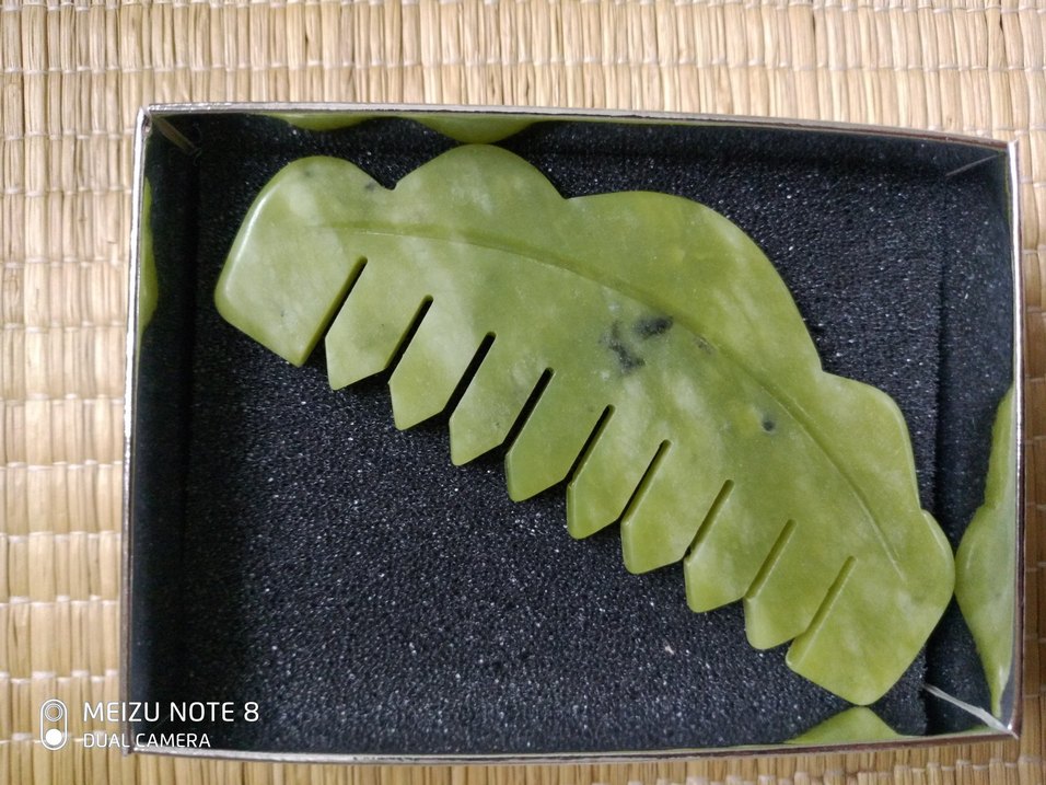 Yeşim taşından yapılmış, yüz masajı için kullanılan doğal taş tarak. Yüz kaslarını rahatlatmaya ve canlandırmaya yardımcı olur.