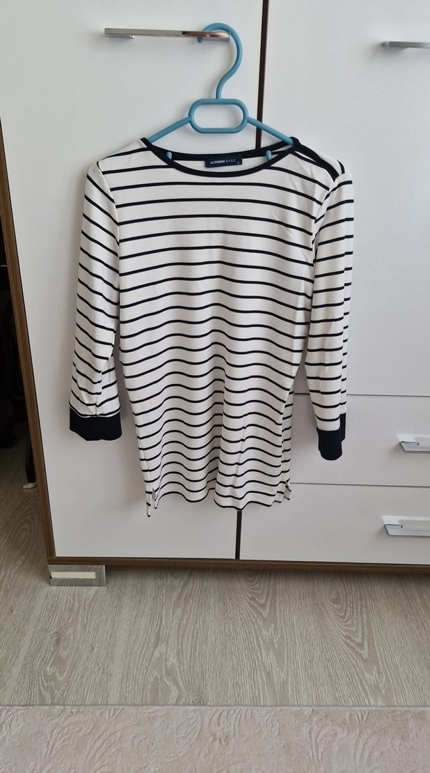 Pamuklu, yetim kol ve yuvarlak yakalı, beyaz ve lacivert çizgili, gündelik kullanıma uygun, şık ve rahat kesim kadın tişörtü.Hiç kullanılmadı denenmeden alındı yıkandı evde denenince olmadı.