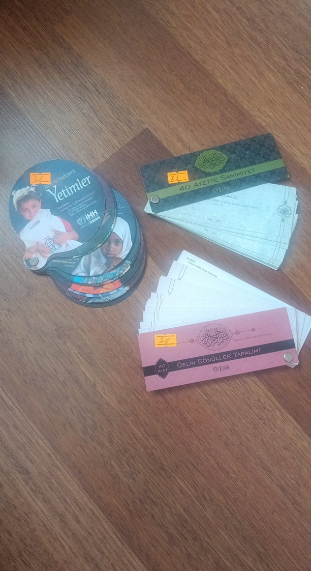 "Yetimler" adlı kitap seti ile birlikte "40 Ayete Samimiyet" ve "Gelin Gönüller Yapalım" adlı dini ayet kartları setleri bulunuyor. tek olarak 25 TL. toplu olarak 60 TL. lütfen almadan önce stok sorunuz.