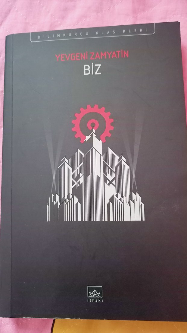 Yevgeni Zamyatin'in "Biz" adlı kitabı, kırmızı dişli ve stilize şehir manzarası içeren siyah kapaklı minimalist tasarıma sahiptir.