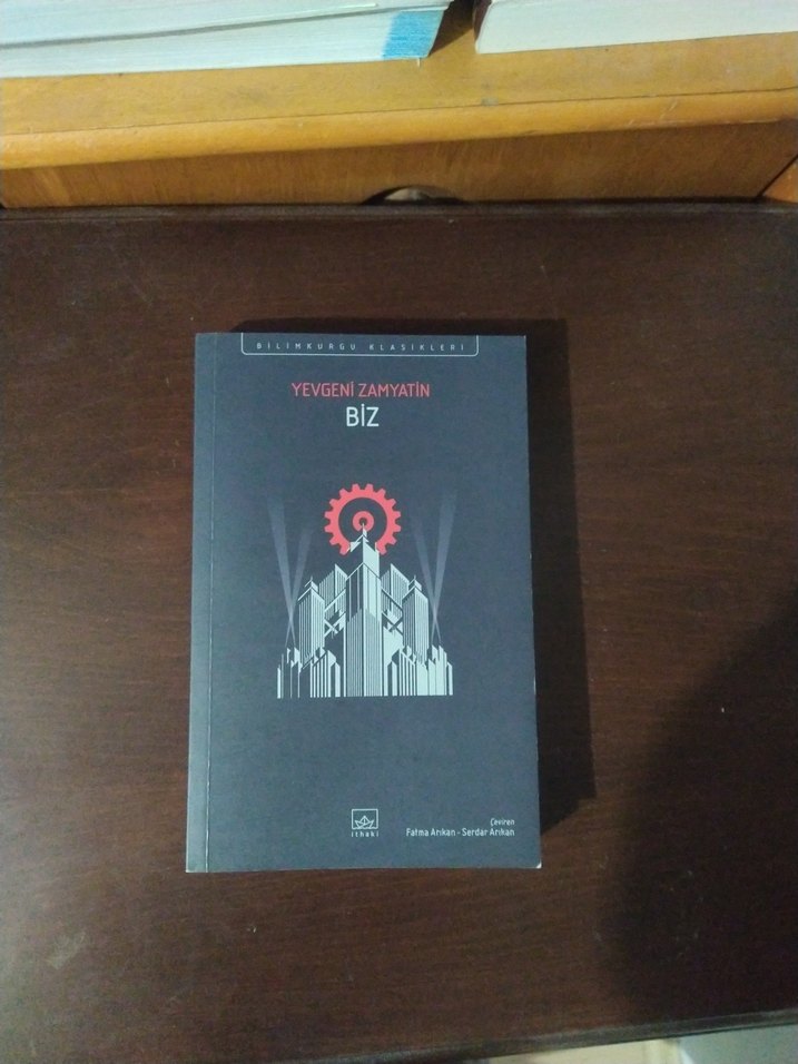 Yevgeni Zamyatin'in "Biz" adlı kitabı, distopik edebiyatın klasik eserlerinden biridir ve endüstriyel tasarımlı kapağıyla dikkat çeker.