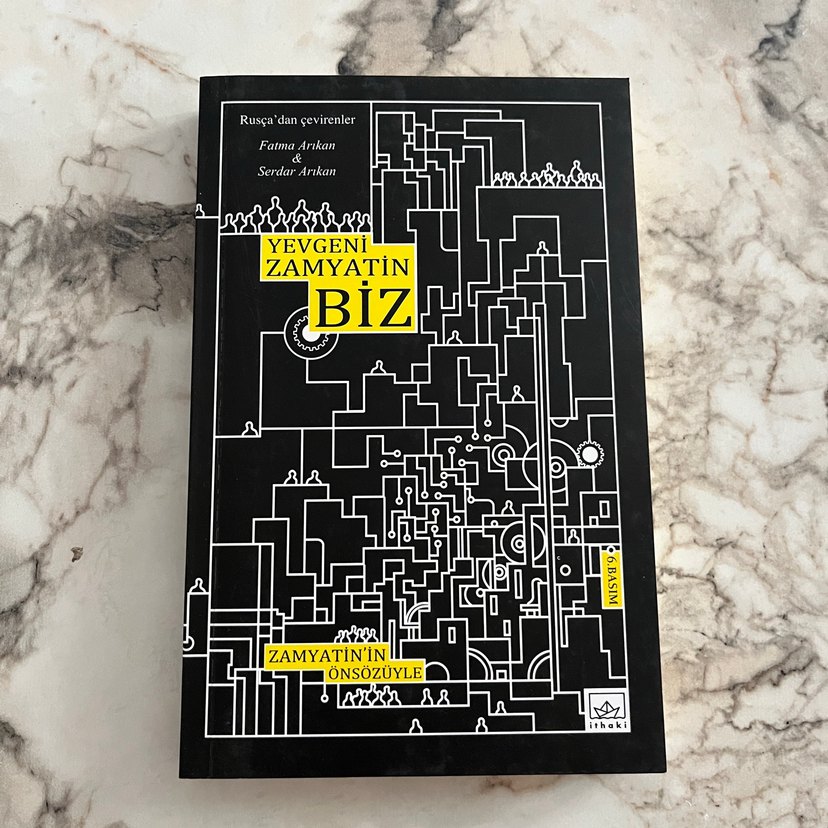 Rusçadan çevrilen ve Zamyatin'in önsözüyle yayımlanan klasik distopik roman Biz, siyah beyaz kapak tasarımıyla dikkat çekiyor.