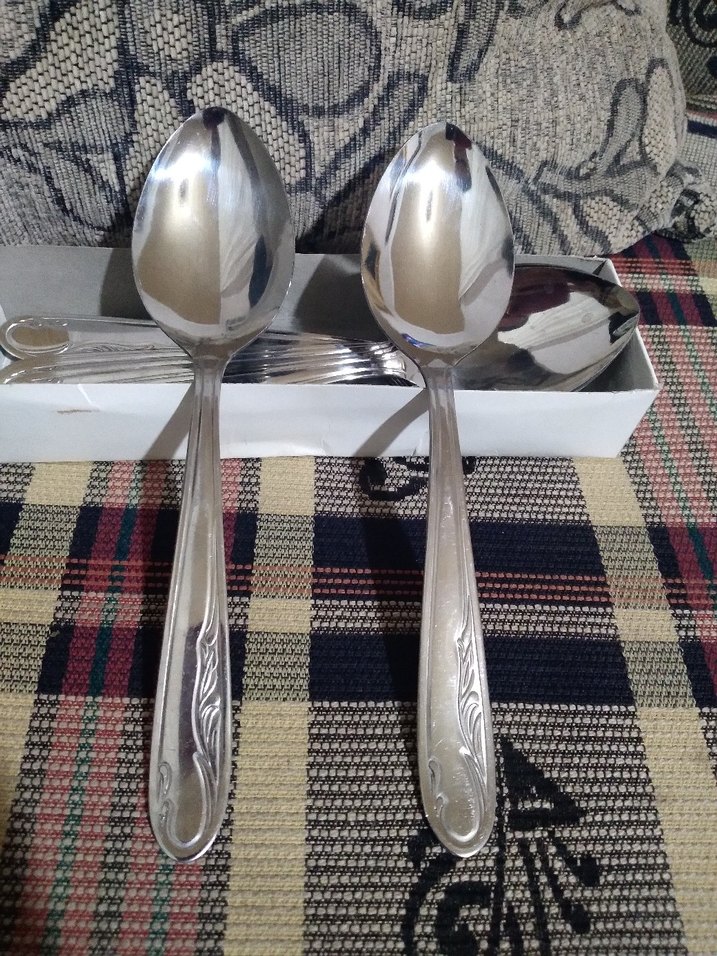 12 adet yemek kaşığı 18/10 Kulp kısmında desen bulunan, parlak ve düz yüzeye sahip paslanmaz çelik kaşık.