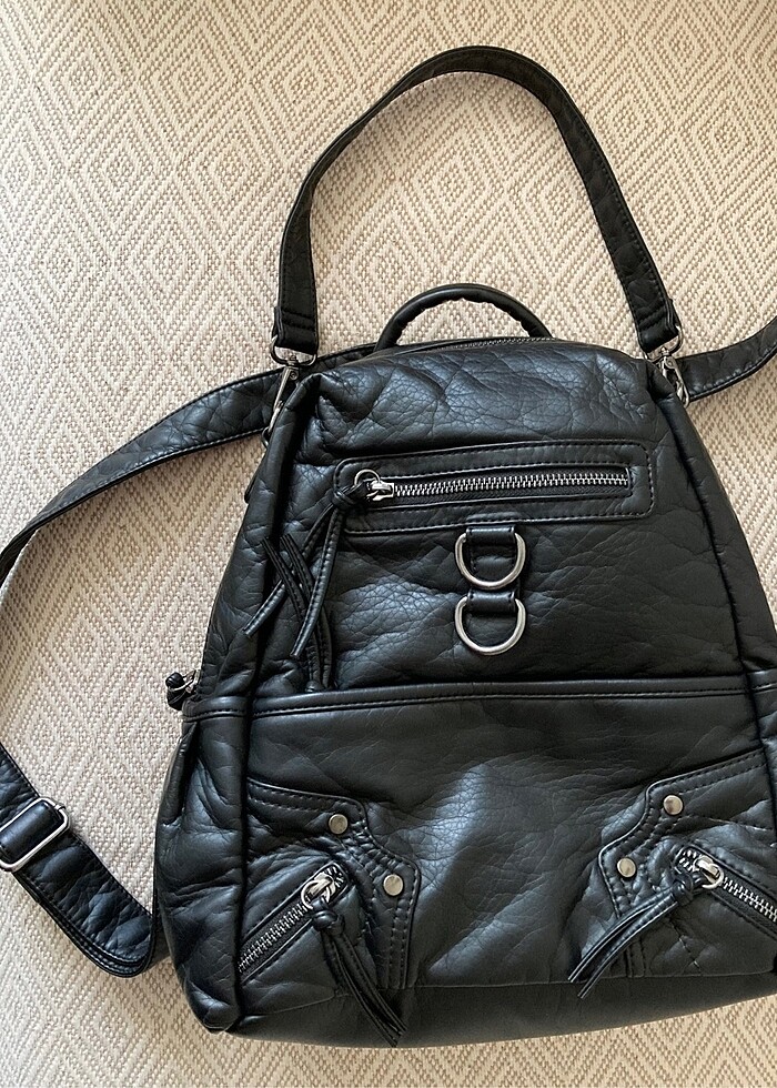 1.kalite sıfır özel dokulu suni deri sırt ve omuz askılı çanta, önde gizli fermuarlı yarım boy ve hemen üstünde fermuarlı bir bölüm, yanlarda cepler ve fermuarlı ana bölüm mevcut. Ebat 25*32 genişlik 13 cm.