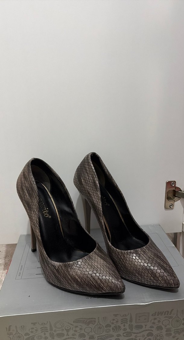 Bej renkli deri stilettolar yılan derisi deseni ve pileli detaylara sahip, minimalist ve klasik ofis stiline uygun.