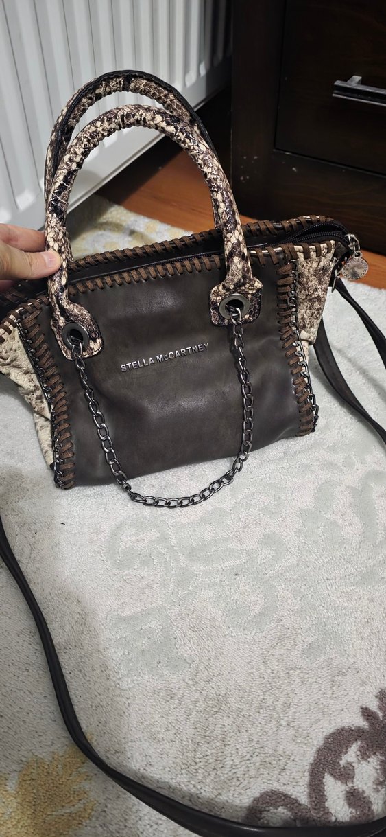 Kahverengi deri çanta, yılan derisi desenli ve zincir detaylıdır. Bohem tarzda, günlük kullanıma uygundur. "STELLA McCARTNEY" markalıdır.