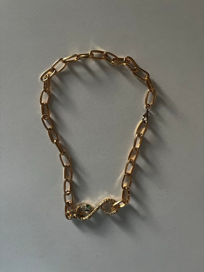 Altın renginde, zincir detaylı ve parlak yılan detaylı kadın kolye