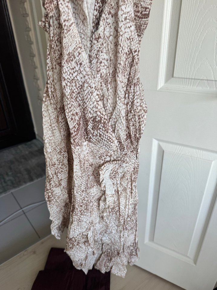 Yılan desenli kahverengi kısa elbise,, yumuşak kumaştan, v yaka anvelop ve kollu kısa elbise