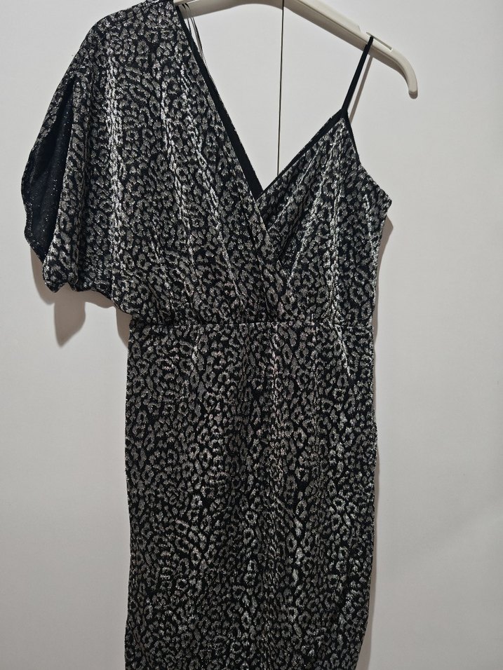 Yılan desenli, asimetrik kesim ve drapeli bu kadın gece elbisesi, V yaka ve kısa mini boydadır. Salaş kesimi ve farklı kollu tasarımıyla partiler için uygundur. L yazıyor ama m ye uyumlu