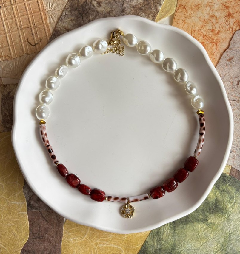 Bohem tarzda, beyaz boncuklar ve yılan desenli kırmızı boncuklarla süslenmiş, altın renk küçük bir charm ile tamamlanmış midi uzunlukta kolye.