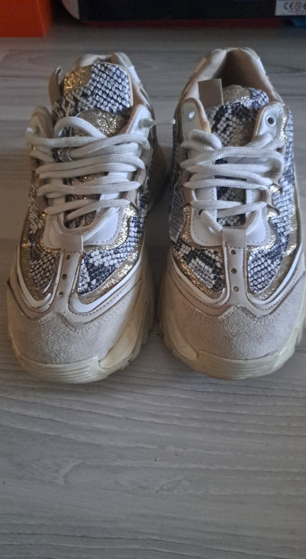 Yılan desenli, beyaz renkli, platform topuklu kadın spor ayakkabısı. Kauçuk tabanlı ve bağcıklı, sportif sokak tarzına uygun.