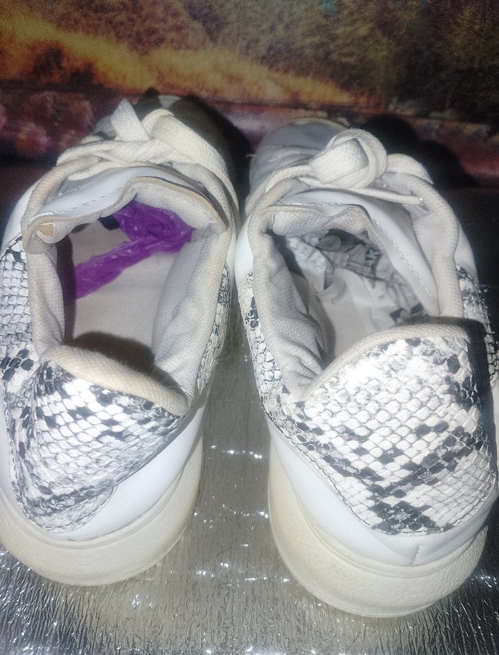 Beyaz yılan desenli platform spor ayakkabılar, bağcıklı ve gri tonlu kauçuk tabanlıdır. Sokak tarzı ve günlük kullanım için uygundur.