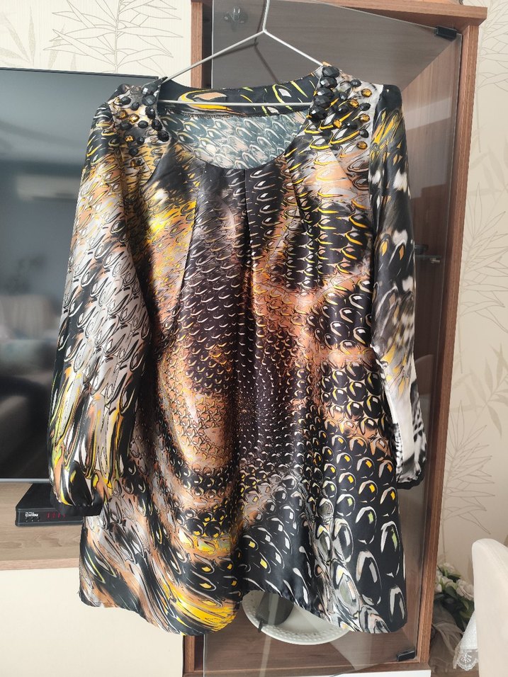 Yılan desenli, drapeli, bol kesim . Uzun kollu, bisiklet yakalı, midi boyda, koyu kahverengi tonlarda bohem tarzda.. marka temsili olarak yazılmıştır saten kumaş
