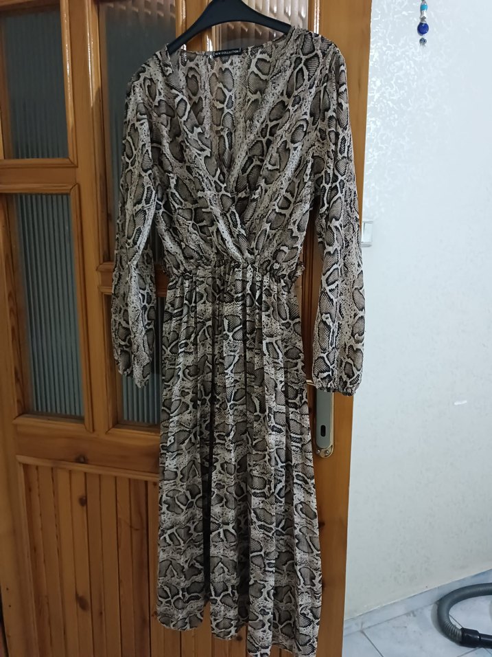 Kahverengi ve gri yılan desenli uzun elbise, drapeli V yaka ve bol kesimlidir. Sentetik kumaştan, bohem tarzına uygun, askılı kolludur.