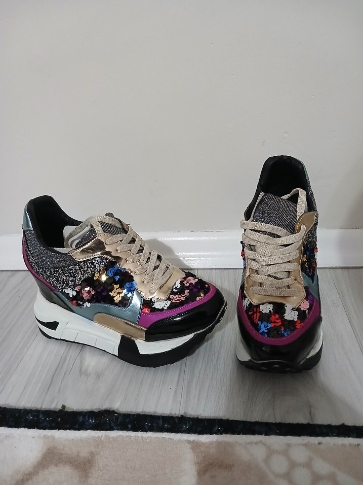 dolgu topuklu kadın spor ayakkabısı. Çok renkli ve kaymaz tabanlıdır, Sokak stili ve spor kombinlere uygundur.