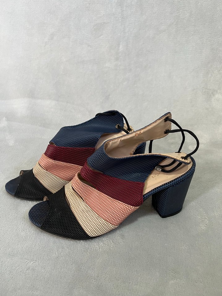 Yılan desenli, çok renkli, plise detaylı, kauçuk malzemeden blok topuklu kadın ayakkabısı. Paris tarzında, günlük kullanıma uygun.