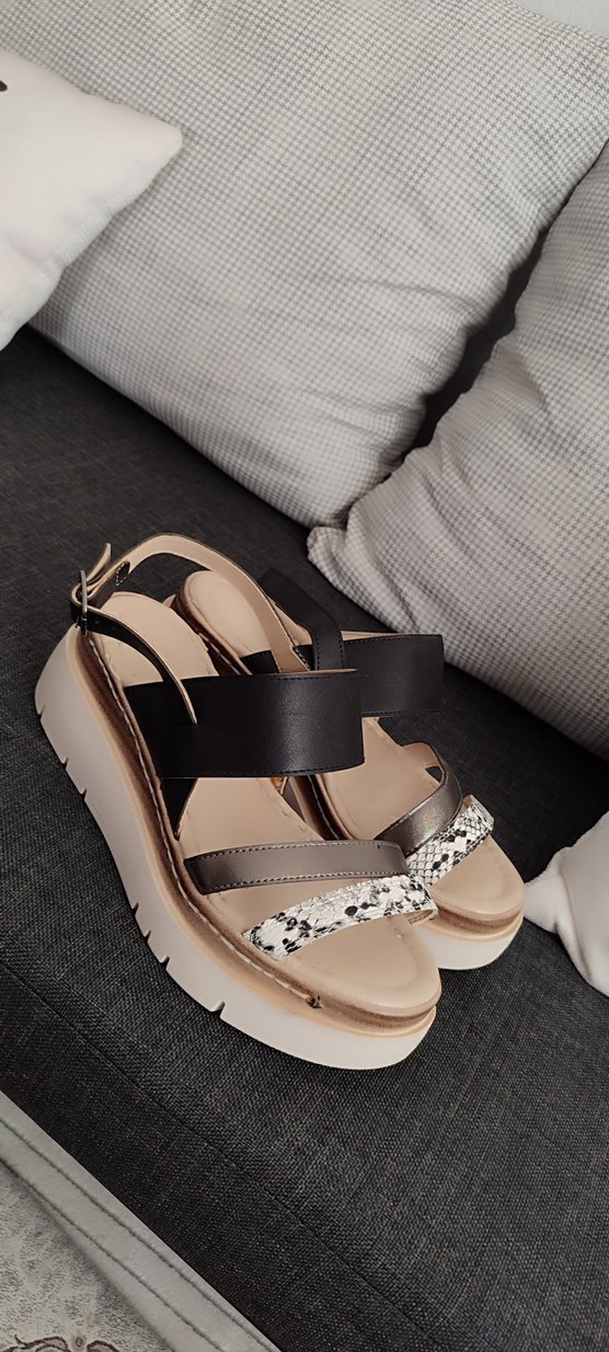 Yılan desenli detaylı, bej ve gri tonlarında, dolgu topuklu ve tokalı kadın sandalet.iç ve yanları dikildi çok az giyildi.