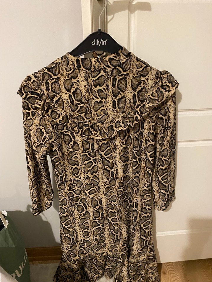 Fakir kollu, bohem tarzda, yılan desenli ve fırfırlı, bol kesim uzun elbise. Günlük kullanıma uygundur. Sorunsuzdur bi kaç kere giyildi kalıbı likralı L beden ama S olarak düşünebilirsiniz
