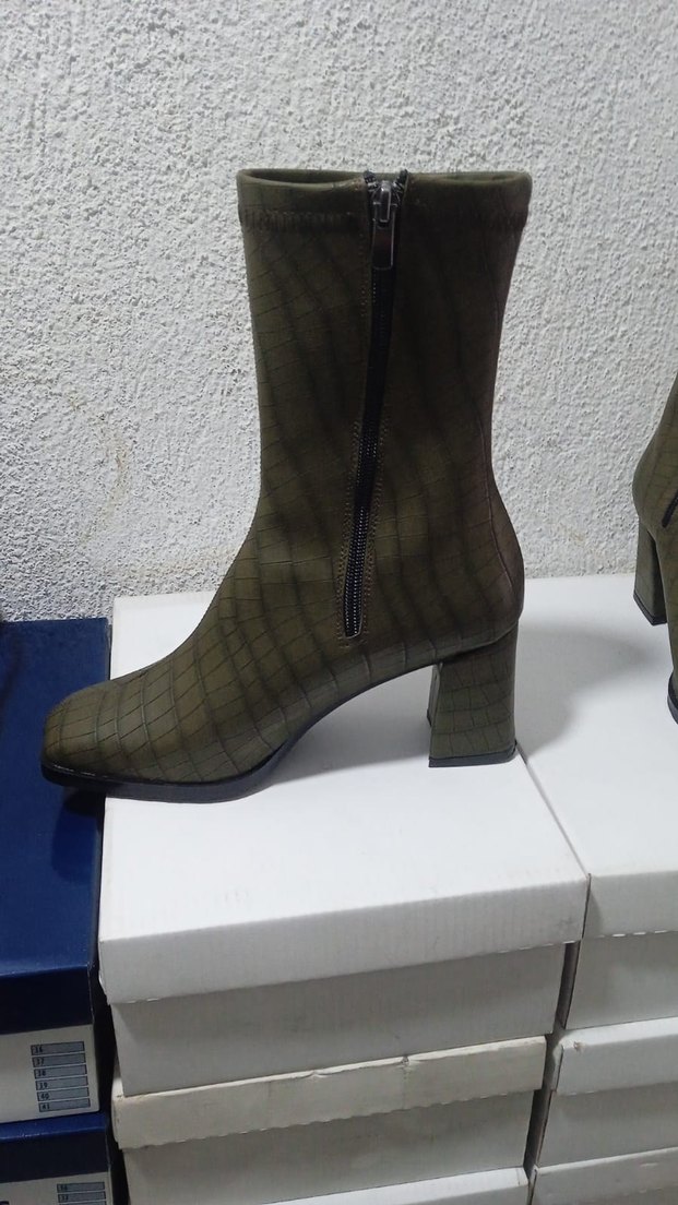 Sentetik kumaştan, yılan desenli, blok topuklu ve fermuarlı haki kadın botları. Günlük kullanım için çağdaş Paris tarzı.