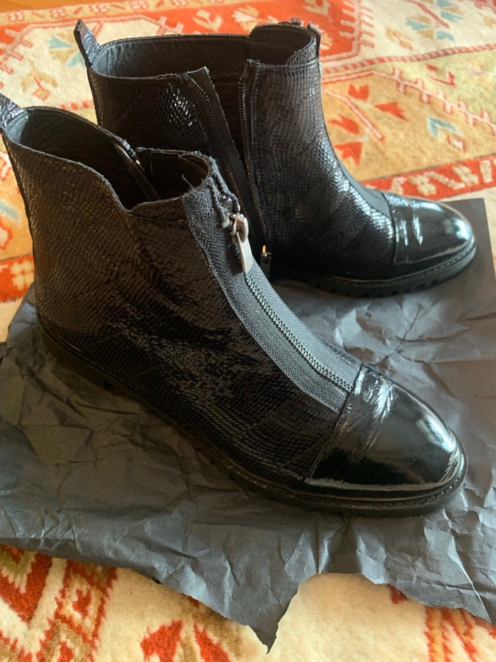 Yılan desenli, yandan fermuarlı siyah rugan deri botlar. Gotik tarzda şık ve dikkat çekici.