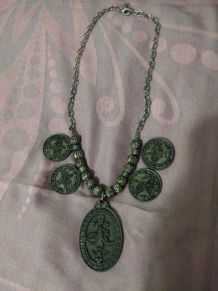 Uzun zincir üzerinde beş koyu Osmanlı desenli madalyon bulunan gotik ve bohem tarzda kolye.