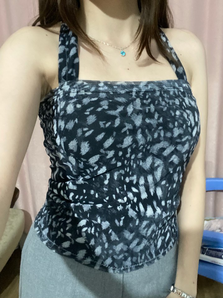 Gri bağcıklı, drapeli ve straplez kesime sahip, ince sentetik kumaştan yapılmış, günlük dış mekan kullanımı için uygun bir midi bluz.