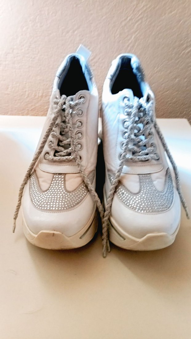 Yılan desenli gri beyaz renkte, dolgu topuklu ve bağcıklı kadın spor ayakkabısı. Kauçuk tabanlı, günlük rahat kullanıma uygun.