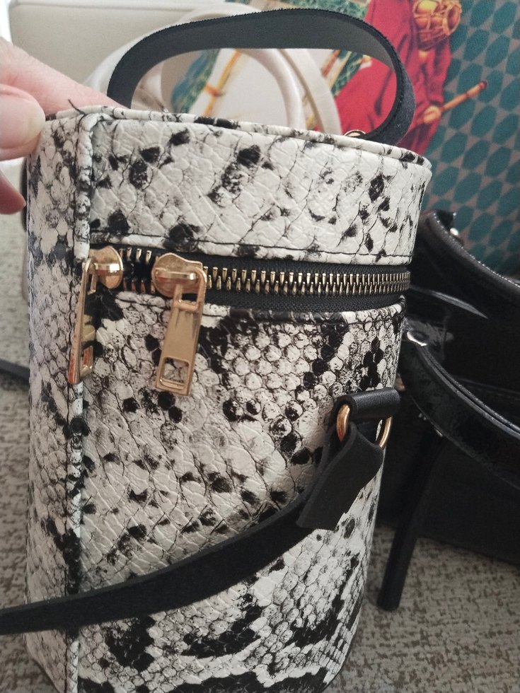 Gri deri çanta, yılan desenli ve fermuarlı, bohem ve Paris tarzını yansıtan şık bir modeldir.