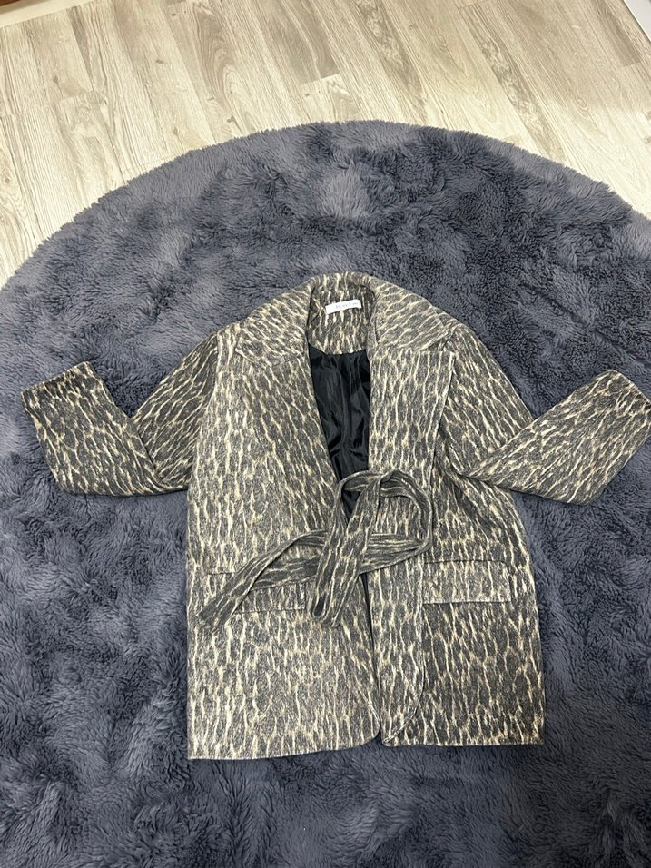 Yılan desenli, uzun ve bol kesim kadın kaban, yumuşak sentetik kumaş ve kürk detaylıdır. Notlu yaka ve uzun kolludur, sokak stili için uygundur.