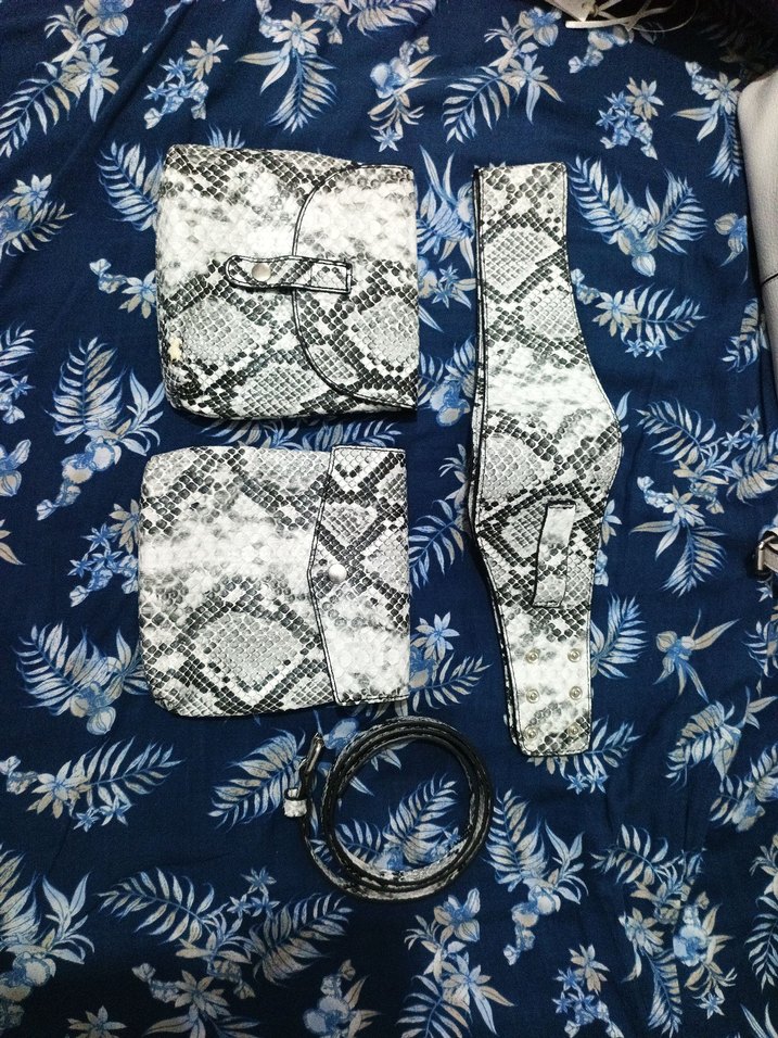 Yılan desenli gri cüzdan ve kemerden oluşan, sokak modasına uygun seti.