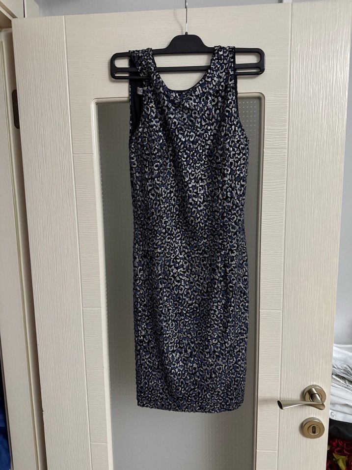 Yılan desenli, drapeli ve yüksek yakalı, kolsuz gri midi elbise. Ofis ve sokak stili için uygundur.