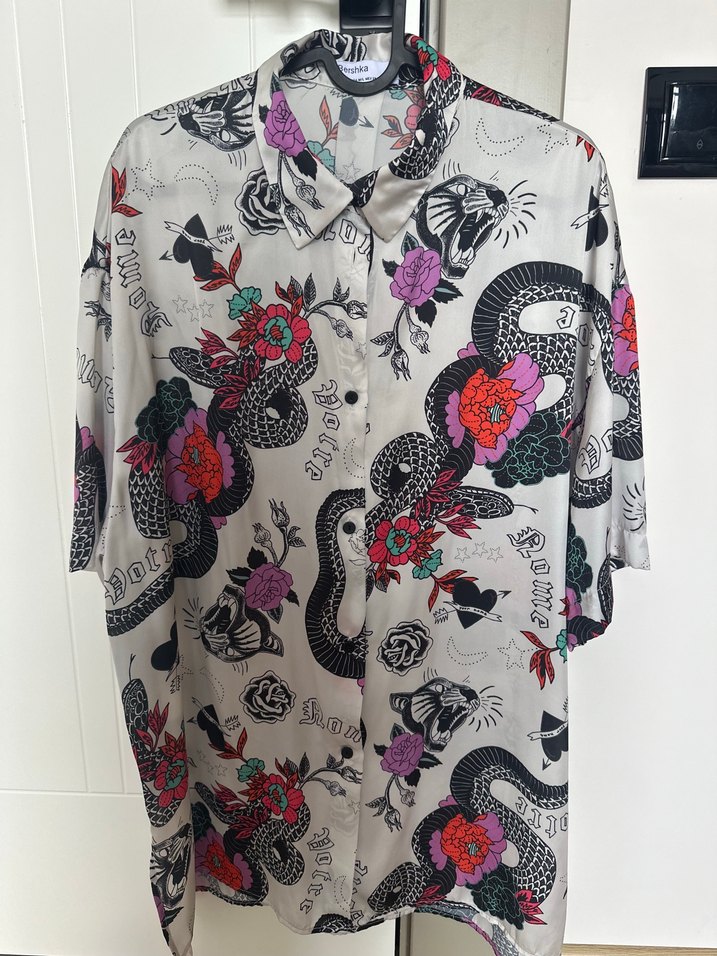 Yılan desenli, düğmeli, kolu kısa, yakalı ve bol kesim midi gömlek. Yumuşak ve parlak kumaştan, bohem stile uygun.
