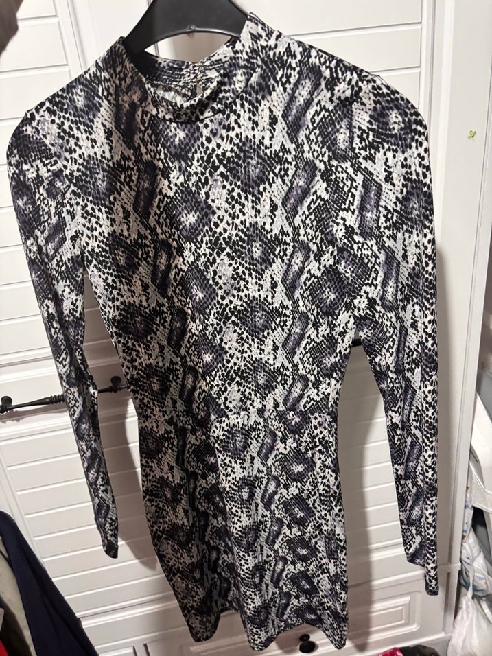 Yılan desenli, uzun kollu, yüksek yakalı ve drapeli gri midi triko elbise. Sokak modasına uygun, yumuşak sentetik kumaştan yapılmıştır.