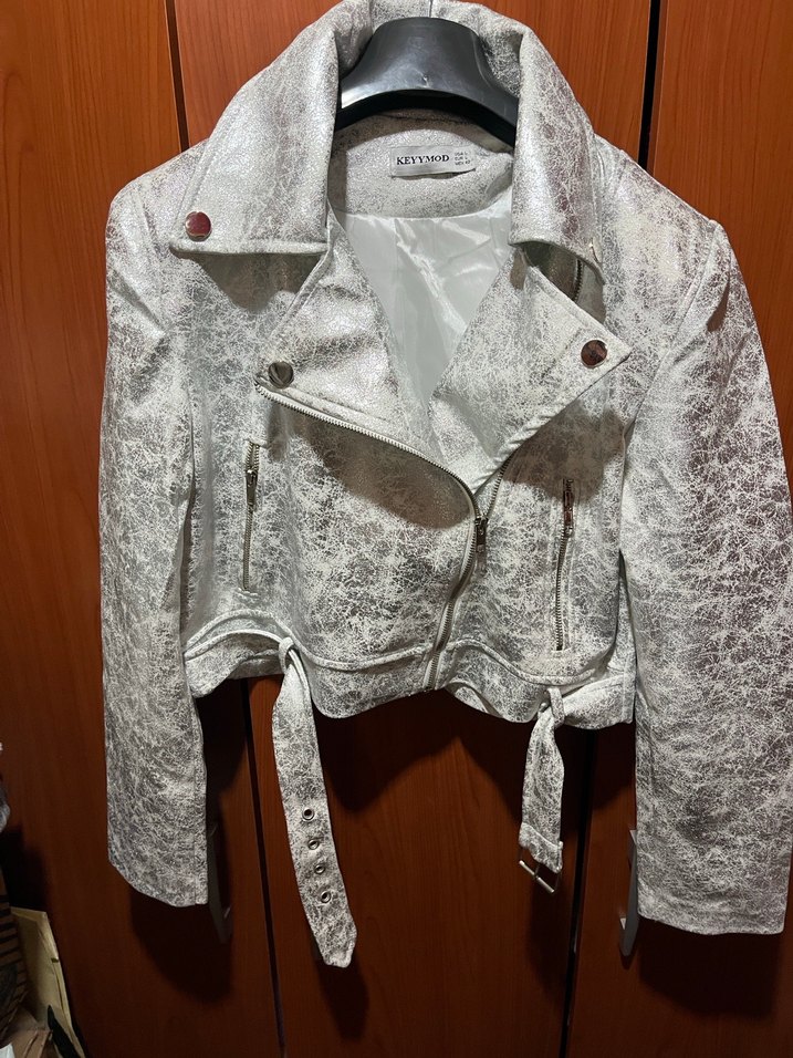 Yılan desenli gümüş ceket, düğmeli ve kesik yakalıdır. Kısa boylu, sıkı kesim ve askılı kollara sahiptir, günlük sokak stili için uygundur.