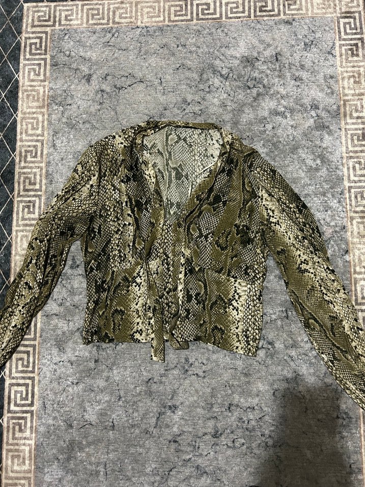 Yılan desenli, kadın bluz. Uzun kollu, vücuda oturan kesim ve balıkçı yaka. Yumuşak sentetik kumaştan, bohem ve sokak stili için uygun.