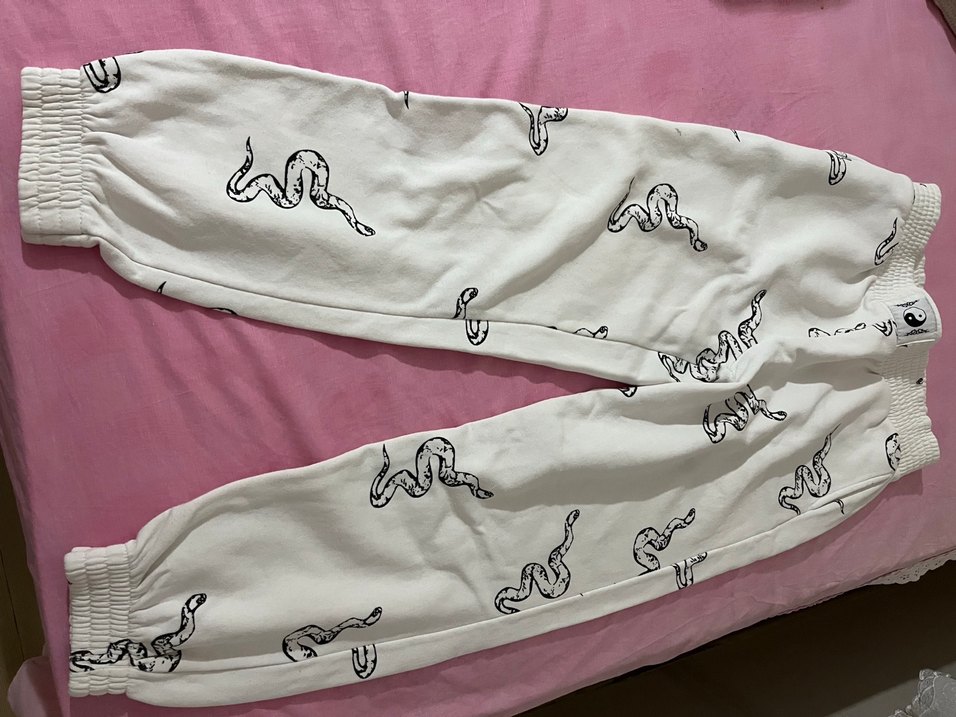 Yumuşak sentetik kumaştan, pastel pembe yılan desenli, rahat kesim kadın eşofman. Elastik bel ve midi boy ile günlük rahat athleisure tarzı.