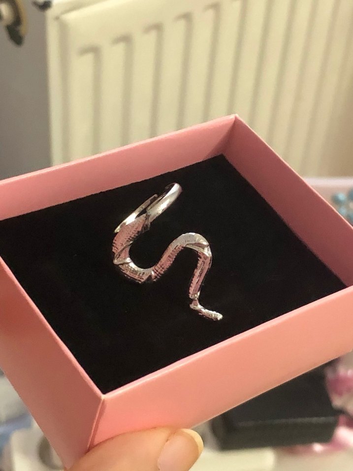 Parlak yılan desenli, kadın yüzüğü. Modern ve minimalist tarzda, romantik akşamlar için ideal.