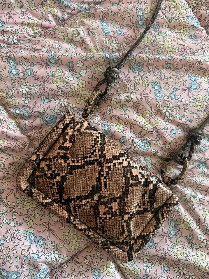 Sentetik kumaştan yapılmış, yılan desenli detaylı kahverengi çanta. Günlük kullanıma uygun bohem ve retro tarzda.