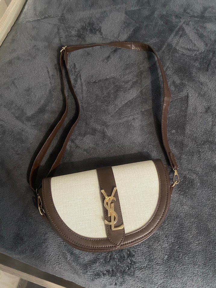 Parlak yılan desenli kahverengi deri kadın çantası, kemerli detay ve şık YSL logosu ile çapraz askılıdır.