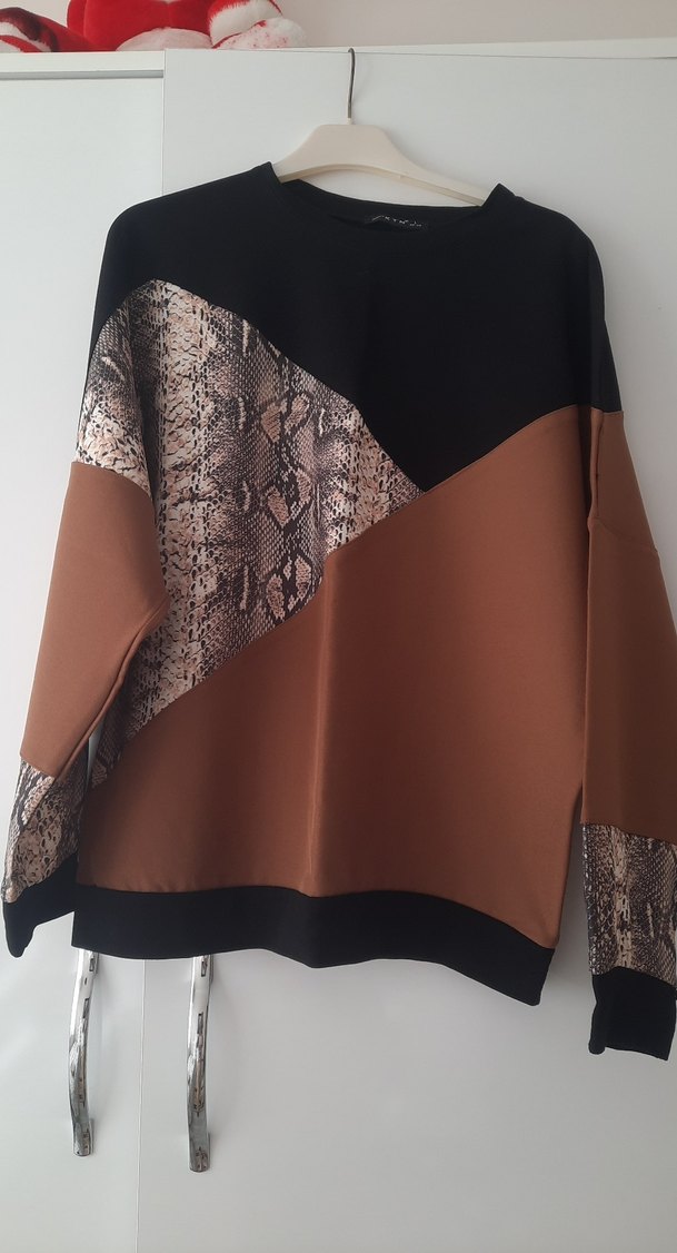 Kadın bluz, yılan desenli, yuvarlak yaka ve uzun kolludur. Gevşek kesimli, kahverengi ve siyah tonlarda drapeli tasarıma sahiptir.