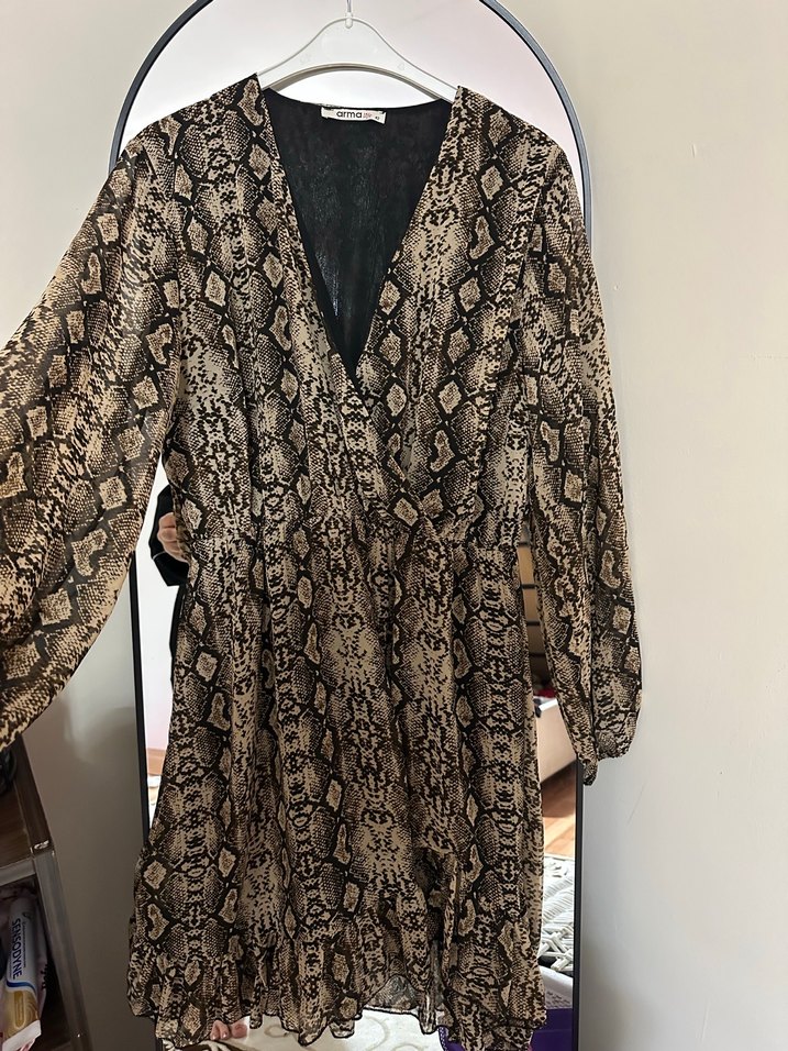 Kahverengi yılan desenli midi elbise, uzun kollu ve bol kesimdir. V yaka ve kürk detaylarıyla bohem tarzı yansıtır.