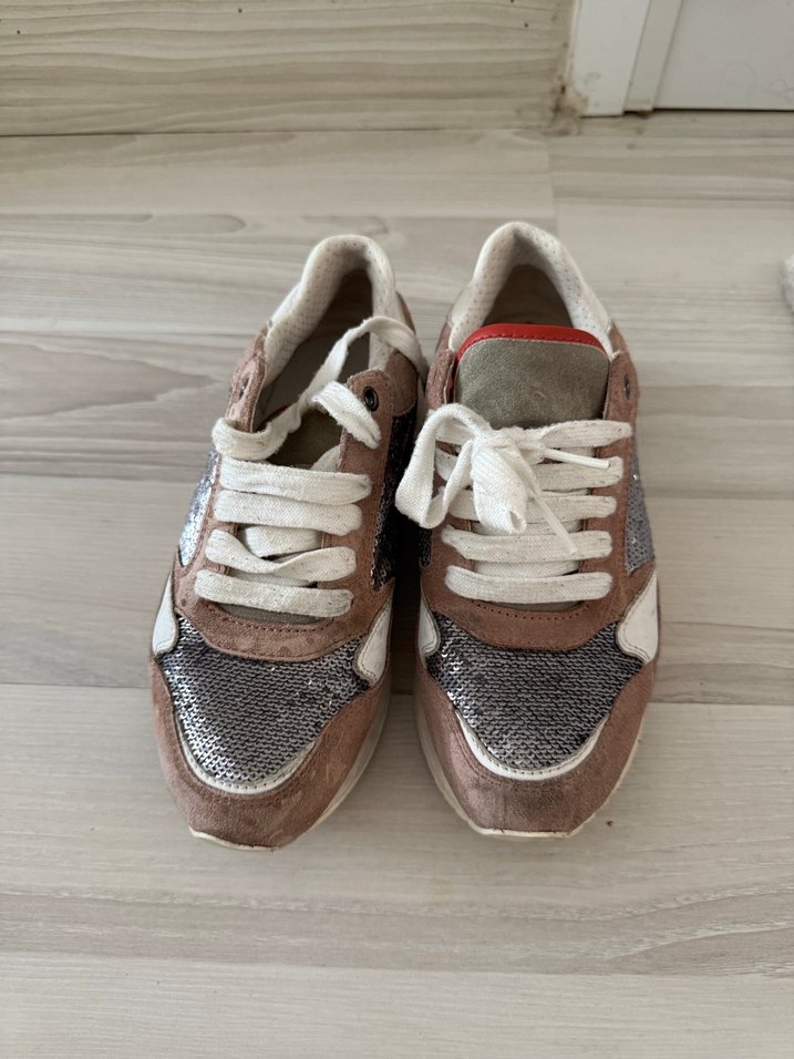 Düz tabanlı, bağcıklı kadın spor ayakkabısı; kahverengi süet ve gri yılan desenli detaylarla sokak modasına uygun.