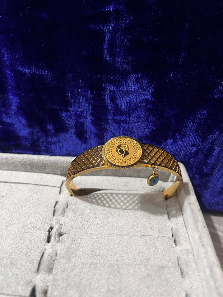 Parlak altın renkli, yılan desenli ve kemerli tasarıma sahip klasik şıklıkta bileklik. Düğün için uygundur.
