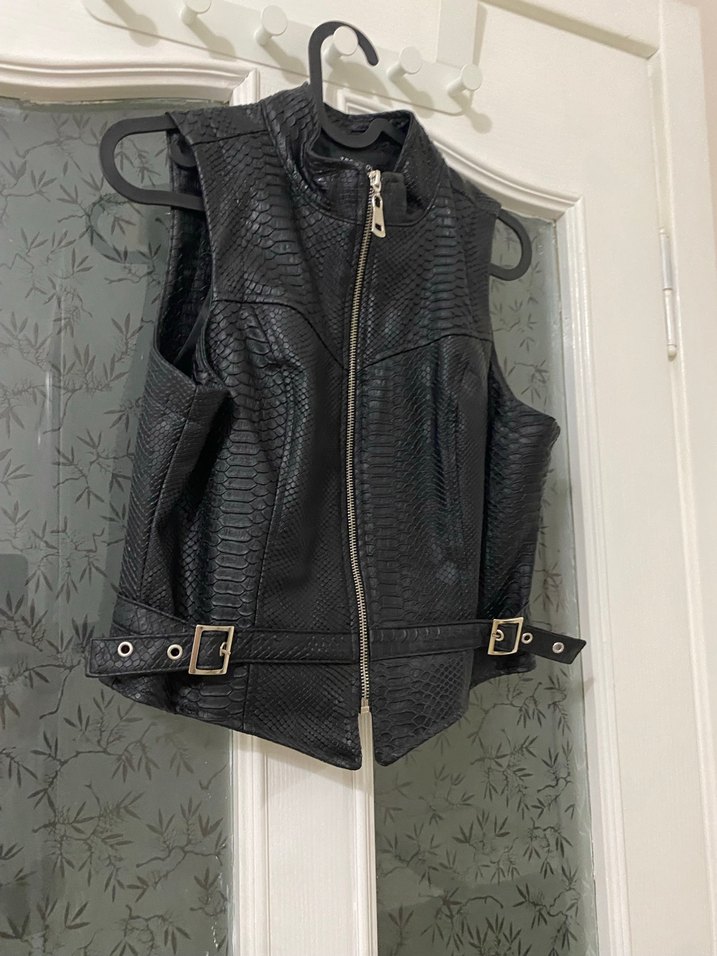 Yılan desenli dokulu siyah deri biker yelek, kolsuz ve yüksek yakalı, kemerli ve vücuda oturan kesimle rock punk tarzını yansıtıyor.
