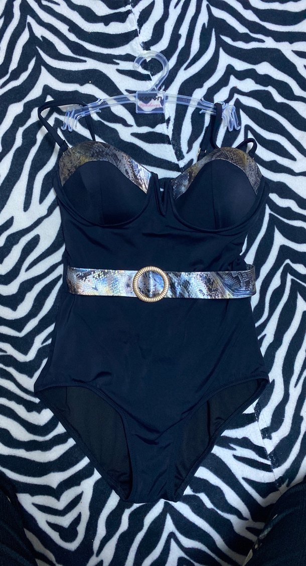Siyah, kemerli ve yılan desenli kemeri olan, ince askılı, vücuda oturan bu mayo cesur gotik ve göz alıcı bir tarz sunar. Hiç giyilmedi eros markasının ürünü yurt dışından alındı