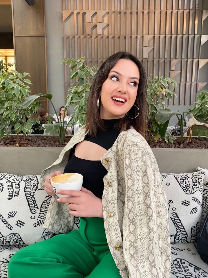 Hafif haki yılan desenli düğme detaylı şık ve günlük ceket