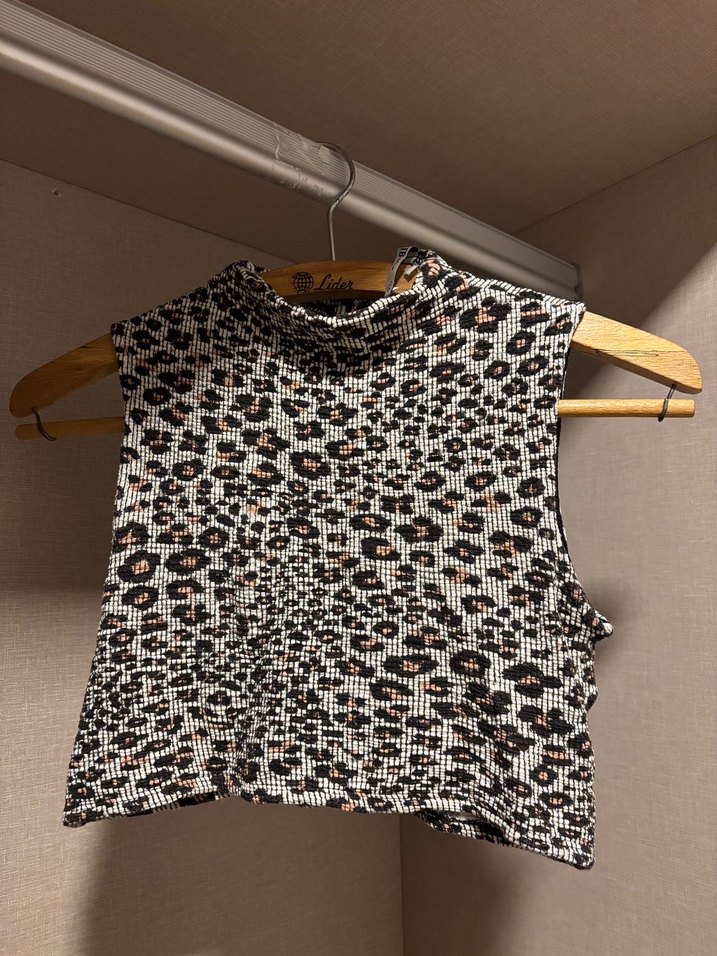Yüksek yakalı, kolsuz ve yılan desenli fitted crop top. Örme dokuma, rahat sokak stili için uygun.